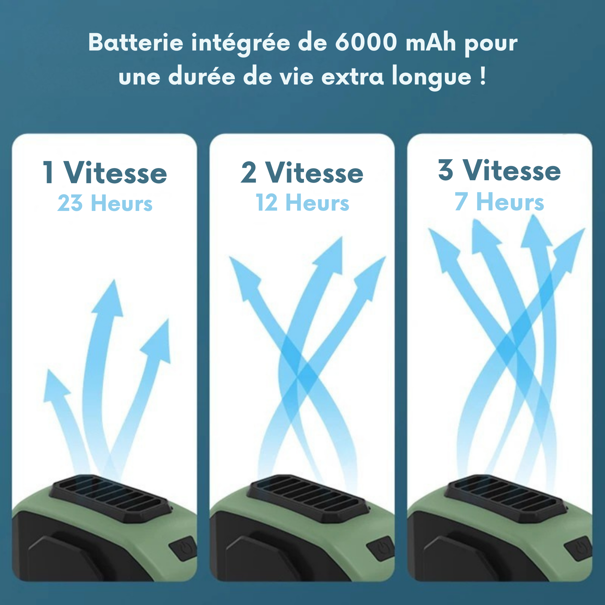 Profitez jusqu'à 5 heures d'air frais grâce à sa batterie rechargeable via USB. Vous n'avez plus à vous soucier de la chaleur en journée, le Flex Fan garde votre énergie jusqu'à la fin de vos activités.
